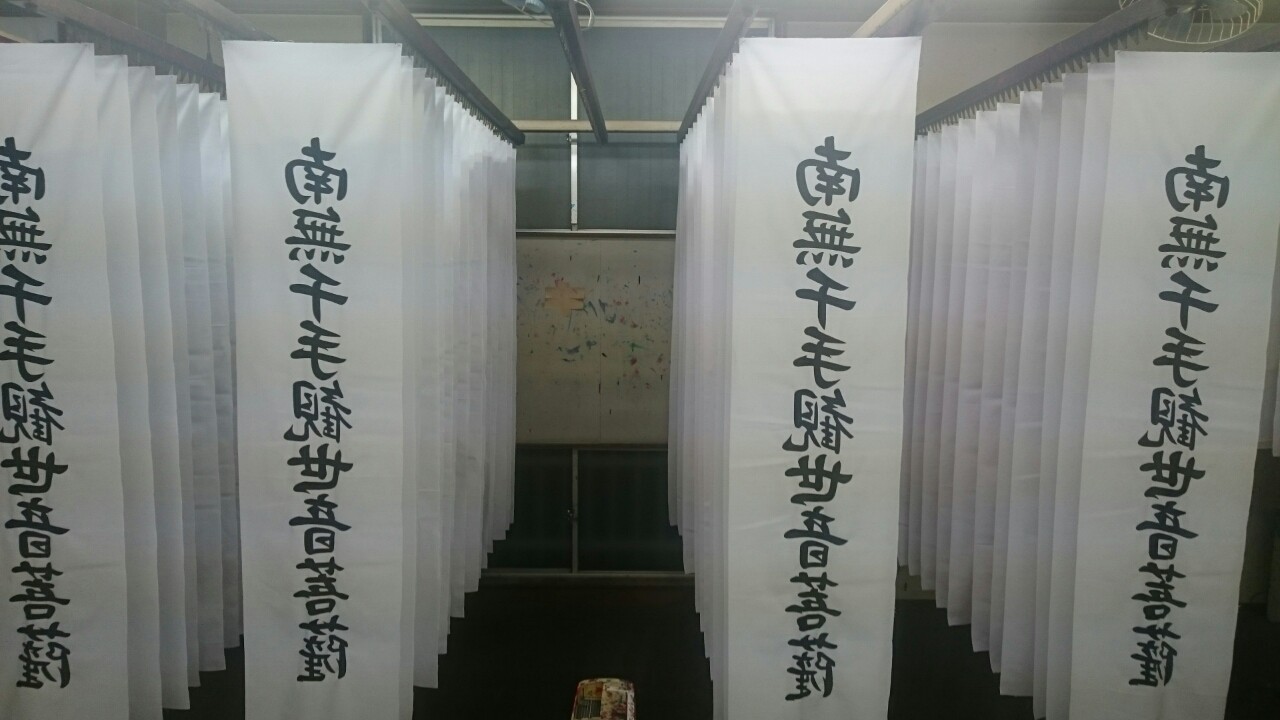 南無千手観音菩薩のお寺のぼりの製作(愛知県名古屋市のお客様) 奉納のぼり(神社のぼり、お寺のぼり), 製作実績 愛知県名古屋市西区のお寺さまからご連絡をいただき、南無千住観音菩薩のお寺のぼり(奉納のぼり)の製作をしました。生地は少し厚手の天竺木綿生地を使用し、丈夫な顔料で染めました。染め文字の色は、同じ型を使用し、白地赤文字 20枚、白地黒文字 80枚で、合計100枚染めました。色使い、生地、枚数などいろいろな提案をさせていただきます。お気軽にお問い合わせください。 南無千手観世音菩薩のお寺のぼり(奉納のぼり)の黒文字バージョンです。型は赤文字と同じ型を使用しています。 南無千手観世音菩薩の幟(のぼり)の型紙をカットしました。これから、製版、染め、仕立てへと進めていきます。 お寺のぼり, のぼり, 南無千手観世音菩薩, 奉納のぼり, 幟, 神社のぼり