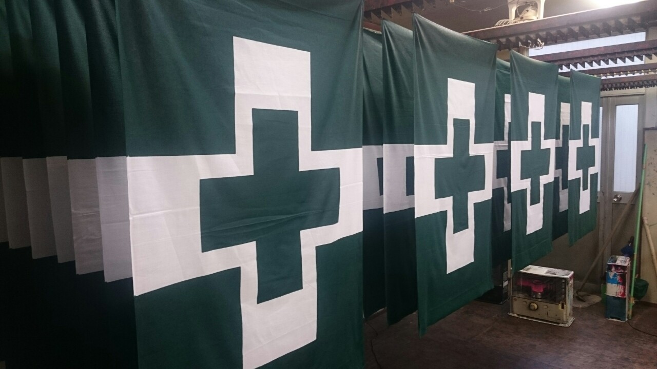 建築現場で使用されることが多い、社旗、安全旗、安全衛生旗などの会社の旗や幕も得意としております。それらの旗とサイズを合わせて製作することもできます。