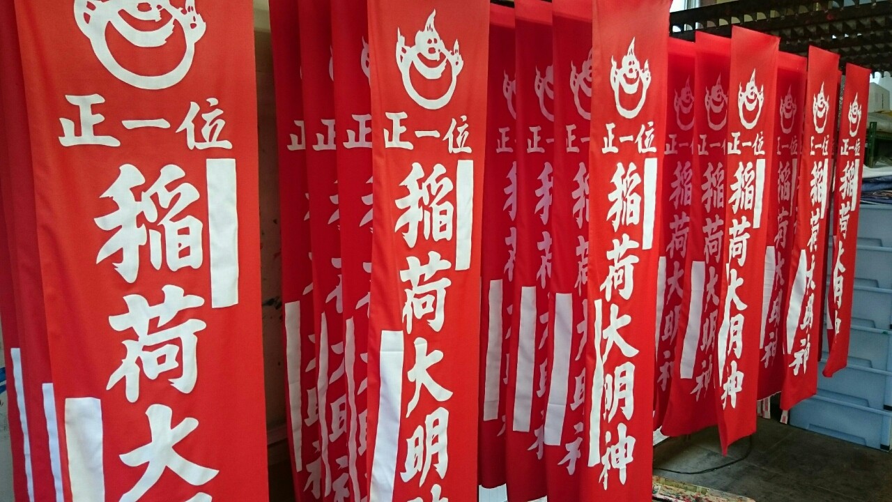 愛知県名古屋市のお客様からのご注文で、奉納のぼり(神社のぼり)稲荷大明神を染めました。