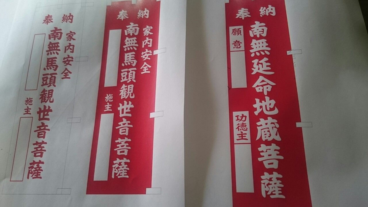 南無延命地蔵菩薩の奉納のぼり(お寺のぼり)は、150枚で見積りをし、南無馬頭観世音菩薩の奉納のぼり(お寺のぼり)は白地赤文字、赤地白抜きの2種類を各100枚で見積りしました。