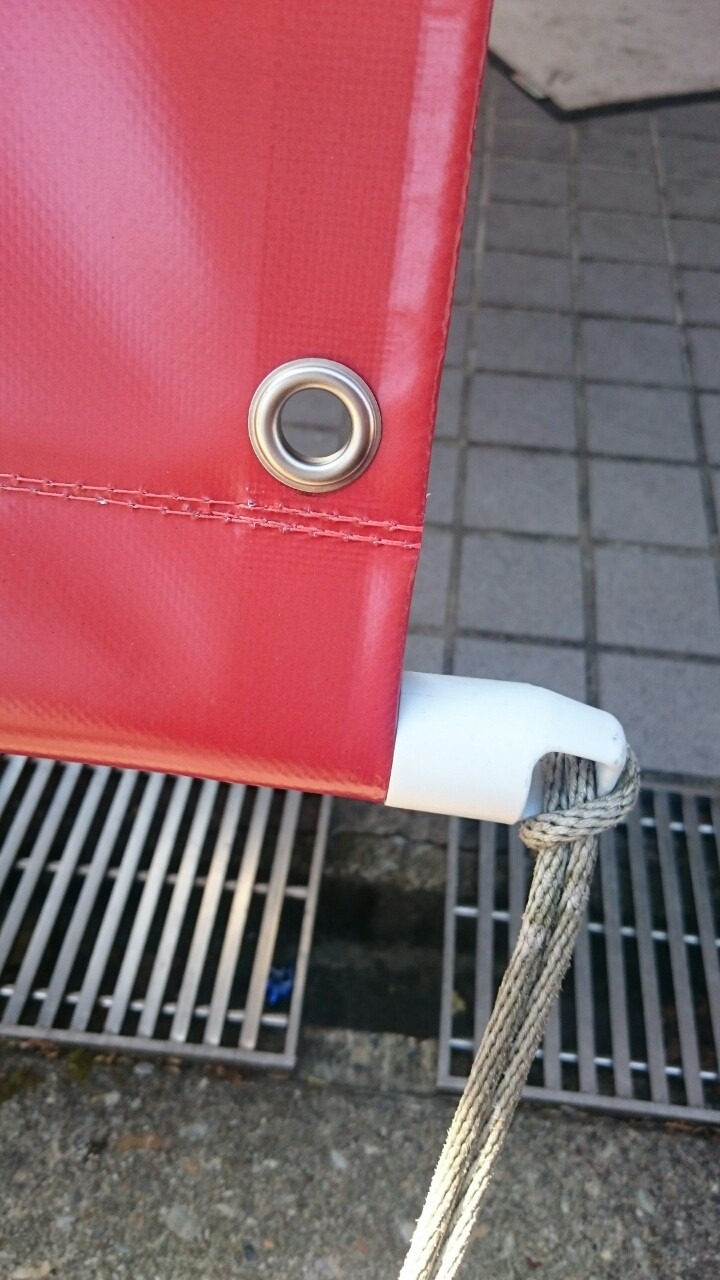 使用していた幕にハドメがあり、お客さまも念のために付けておいてとのことでしたので、ハドメも加工してあります。