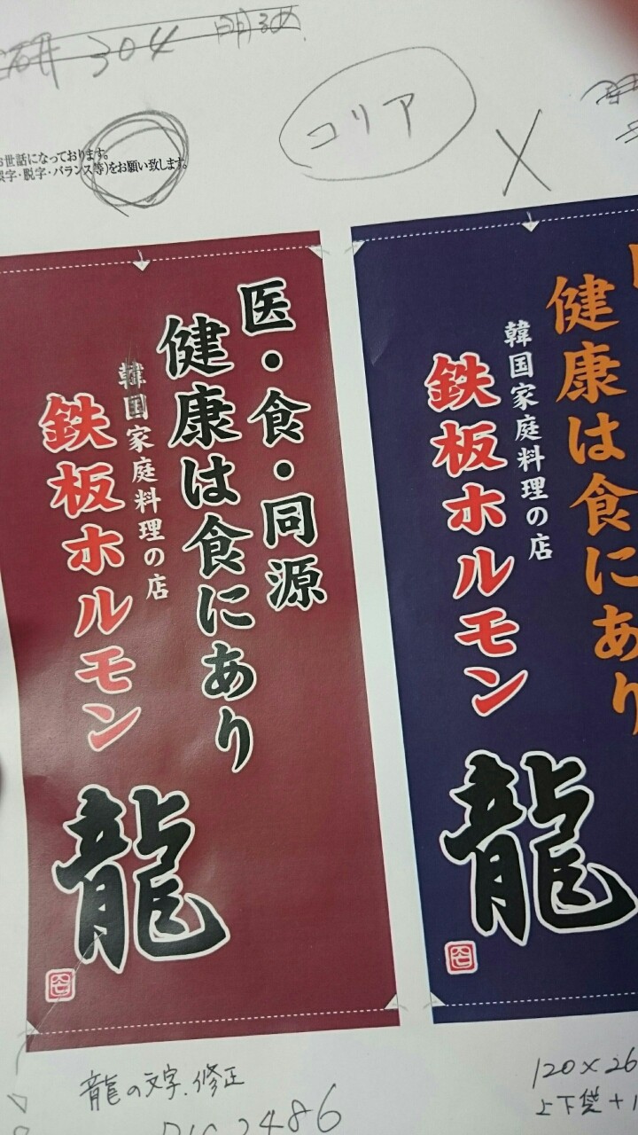 愛知県名古屋市北区にある鉄板ホルモン龍さまから、オリジナルの幕(店頭幕)のご注文をいただきました。