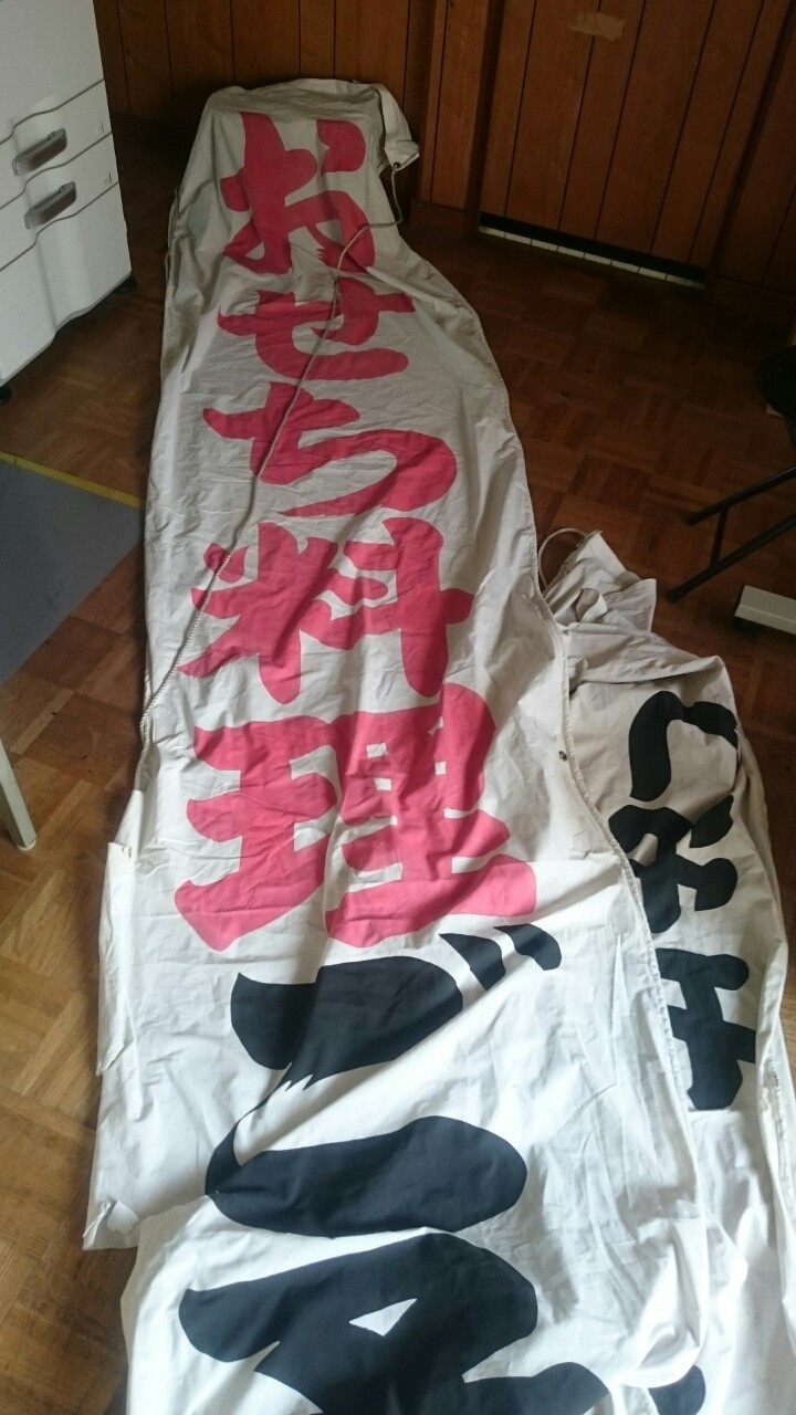 今まで使用していた幕と同じ生地、天竺木綿生地を使用し、日焼けに強い顔料で赤文字、黒文字の2色で染めました。